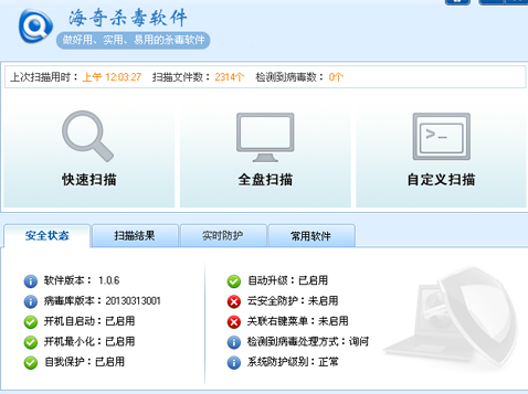 海奇殺毒軟件一款完全免費(fèi)的殺毒軟件,本軟件擁有全自主研發(fā)的傳統(tǒng)掃描殺毒技術(shù)與云安全防毒系統(tǒng)于一身,從防毒殺毒兩方面為您的電腦提供超強(qiáng)、全方位保護(hù)。