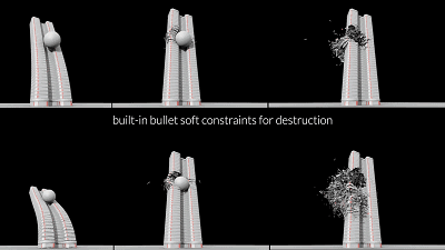 3、基于材料的破壞工具通過提供預(yù)壓裂材料(如混凝土,玻璃和木材)的工具,同時(shí)自動構(gòu)建將整個系統(tǒng)連接在一起的約束網(wǎng)絡(luò),使設(shè)置和藝術(shù)直接破壞鏡頭更容易。