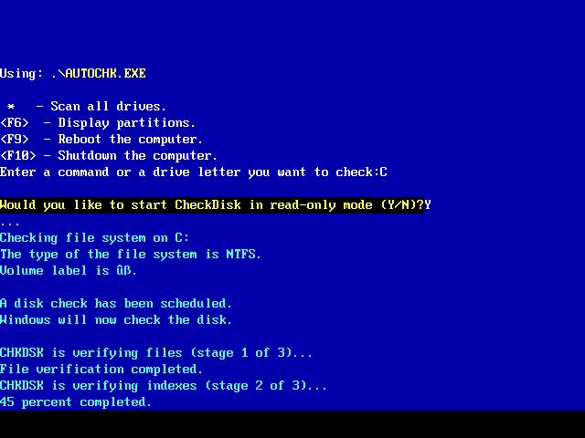 如果在大磁盤(例如,70 GB)或有大量文件(數(shù)百萬)的磁盤上使用 chkdsk /f,這可能要花很長時間(比如說,數(shù)天)才能完成。因為 chkdsk 直到工作完成它才會交出控制權(quán),所以計算機在這段時間內(nèi)將不可用。