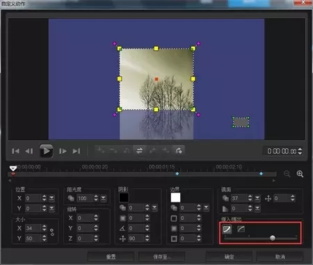 2、緩入/緩出設(shè)置。則是素材進(jìn)入畫面的速度,點(diǎn)擊緩入或者緩出的按鈕,在調(diào)整滑軌,調(diào)整速度,如圖所示。