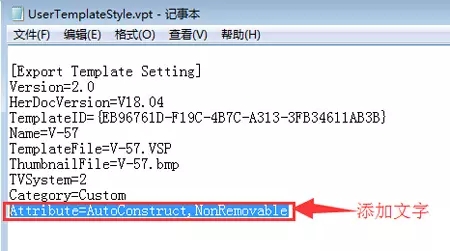 打開剛剛導(dǎo)出的模板文件夾,打開UserTemplateStyle.vpt這個(gè)文件,在文件的末尾添加:Attribute=AutoConstruct,NonRemovable;