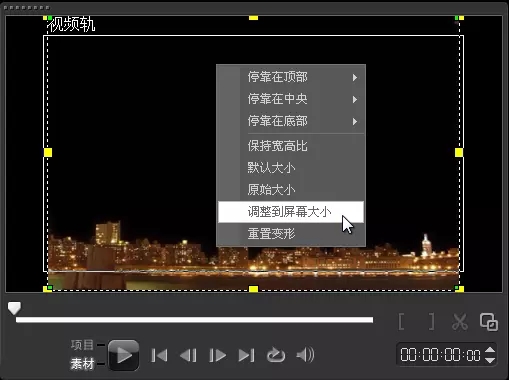 選中素材,右擊鼠標(biāo)選擇“調(diào)整到屏幕大小”,在預(yù)覽窗口中單擊鼠標(biāo)右鍵,執(zhí)行“調(diào)整到屏幕大小”命令。