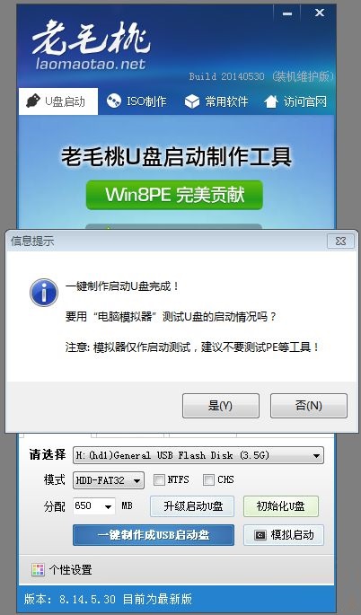 5、彈出提示框,一鍵制作啟動(dòng)U盤完成,詢問(wèn)是否啟動(dòng)模擬器,點(diǎn)擊是;