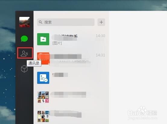 登錄微信電腦版后我們就進(jìn)入了微信聊天界面了,鼠標(biāo)移動(dòng)到左側(cè)的通訊錄圖標(biāo)點(diǎn)擊進(jìn)入。