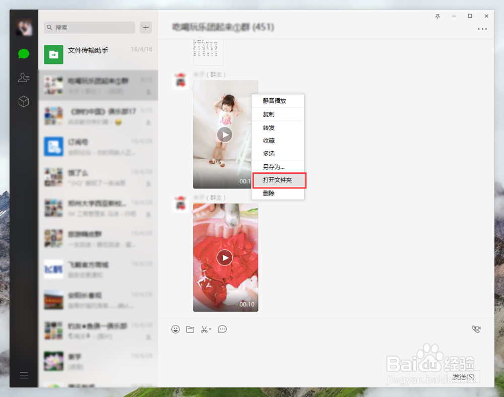 我們可以先通過(guò)圖片或視頻來(lái)直接找到文件存放的位置,然后記住這個(gè)位置,下次需要的時(shí)候找到這個(gè)位置就可以啦。首先我們?cè)谖⑿烹娔X版中找到之前收到的文件的聊天記錄,例如在下圖中,我找到的一個(gè)視頻,鼠標(biāo)右鍵視頻,找到【打開(kāi)文件夾】,點(diǎn)擊進(jìn)入。