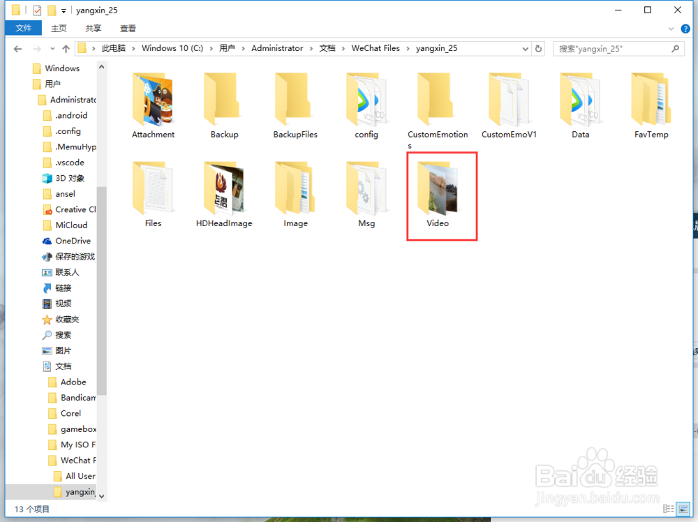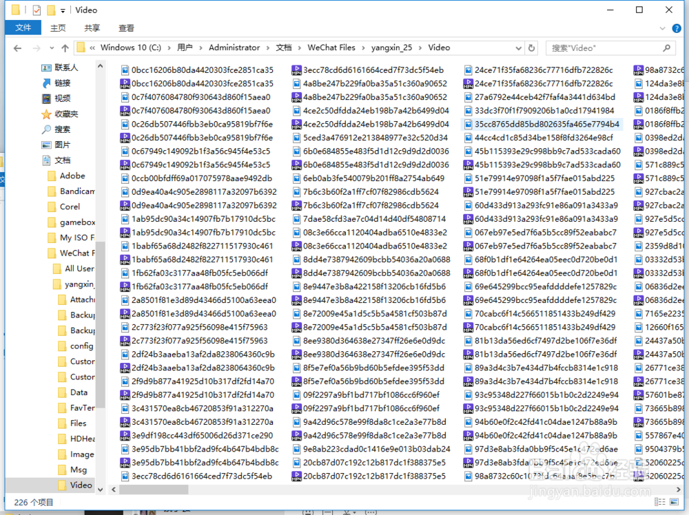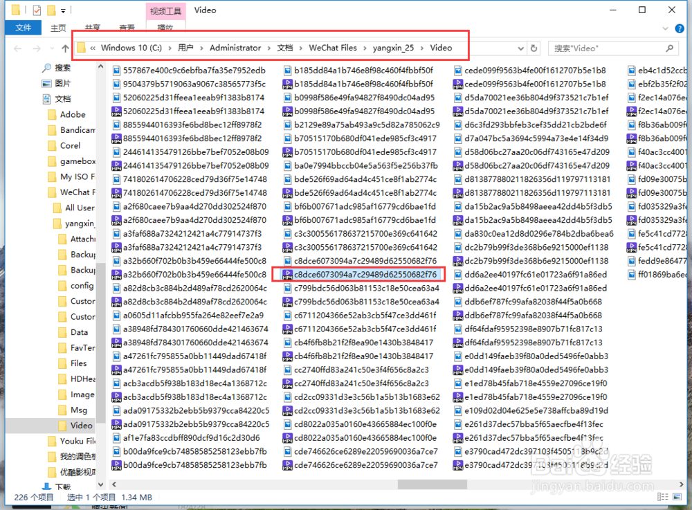 點(diǎn)擊后會(huì)打開(kāi)一個(gè)文件夾,中間位置系統(tǒng)默認(rèn)選擇的就是我們剛才在聊天窗口右鍵點(diǎn)擊的那個(gè)視頻,我們?cè)倏次募A頂部的位置,這個(gè)位置就是微信電腦版默認(rèn)保存視頻的位置。下面我們從電腦中逐個(gè)找到存放的位置。