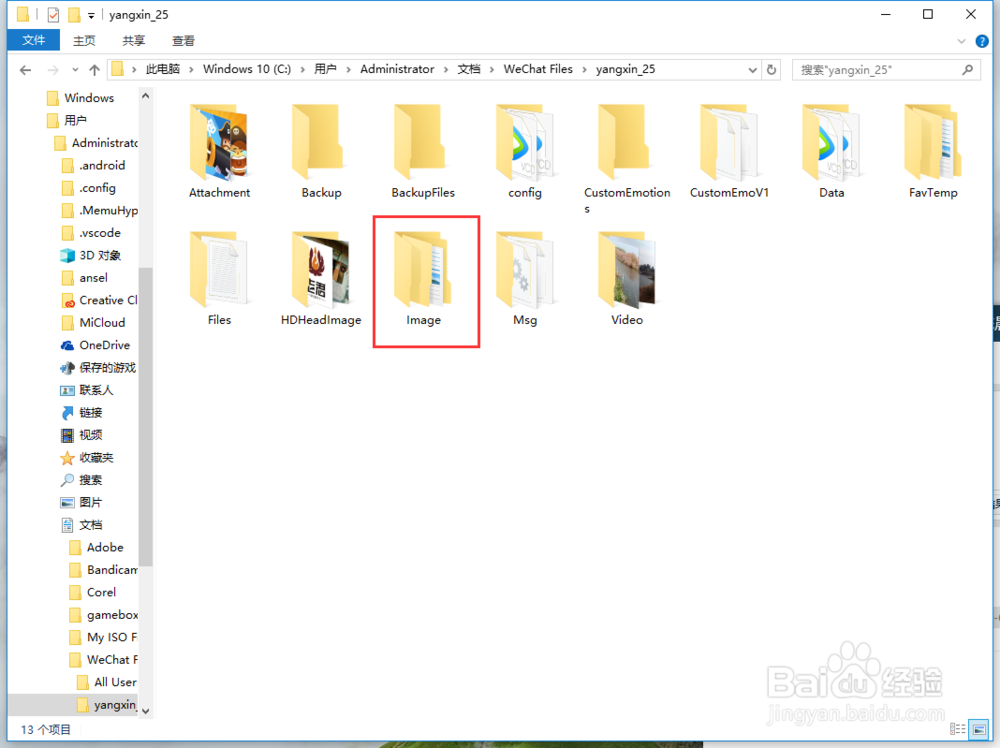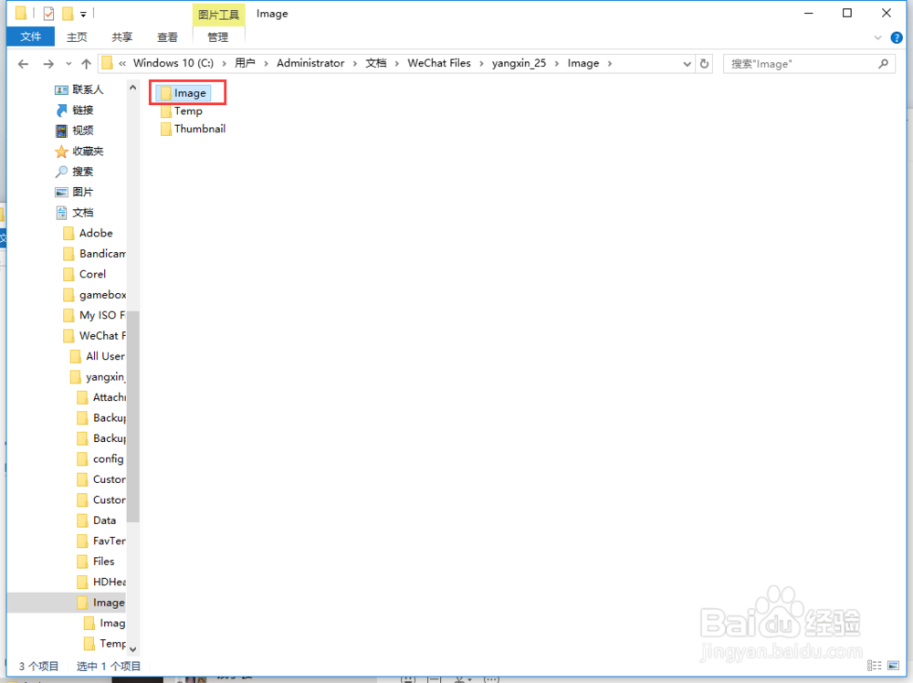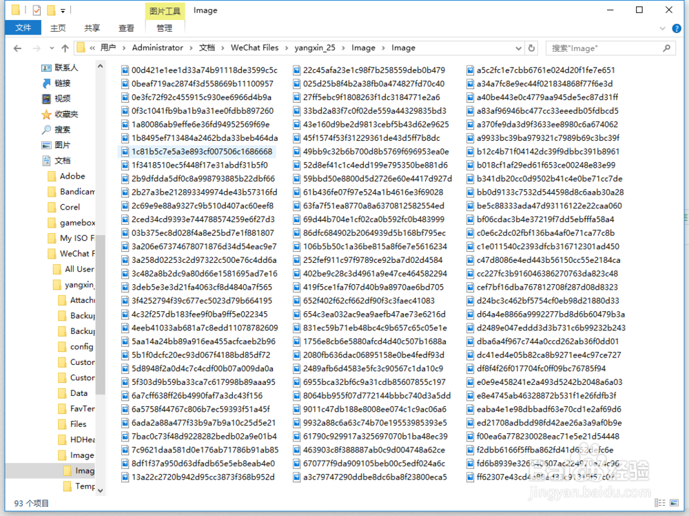 然后返回【W(wǎng)echat Files】文件夾,打開(kāi)【Image】文件夾,在里面還有一個(gè)【Image】文件夾,點(diǎn)擊進(jìn)入后,就看看到所有圖片列表,微信電腦端里所有的圖片都在這個(gè)文件夾中。