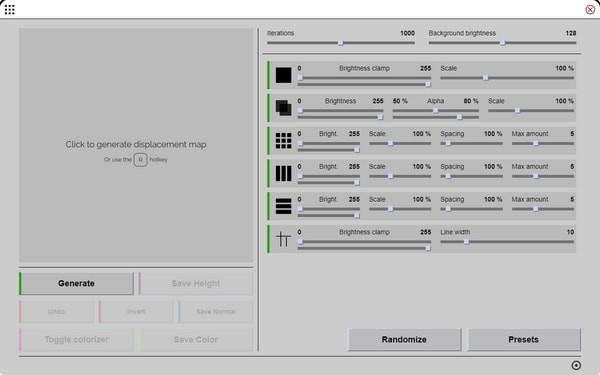 JSplacement是一個用HTML和JS編寫的跨平臺偽隨機8K位移地圖生成器,可以快速生成各種科幻風格的貼圖,生成這種貼圖我們就可以用在材質中做置換貼圖了,可以生成5類置換圖,輸出可至8k等!【軟件特點】