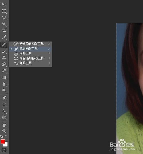 ps如何去眼袋?1、首先選擇軟件左方工具欄的“修復(fù)畫筆工具”,給您的皮膚作一個(gè)修復(fù)的效果。