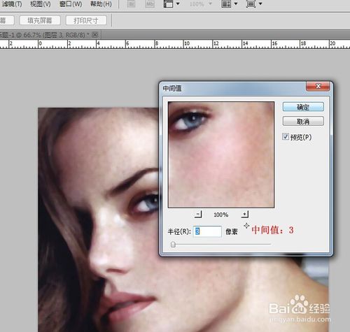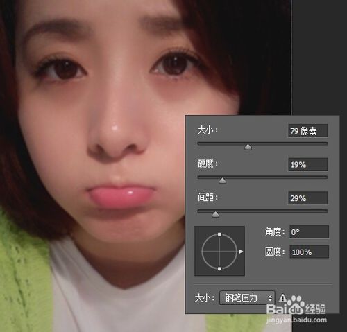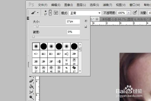 5、把涂抹工具放到圖片上面,依然點(diǎn)擊鼠標(biāo)右鍵進(jìn)行大小調(diào)整,然后在導(dǎo)航欄下面,調(diào)整它的強(qiáng)度,盡量調(diào)低,然后在黑眼圈位置進(jìn)行涂抹。