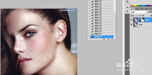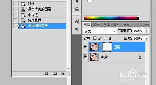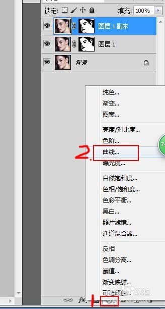 13、再將圖層1副本 進(jìn)行一次 五官清晰一遍,按Alt 點(diǎn)擊 圖層1副本的圖層蒙版 對(duì)五官進(jìn)行涂抹。如下圖所示,添加曲線