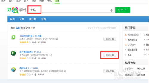 接著我們利用搜索引擎搜索下載“凱立德導(dǎo)航助手”程序,小編使用“360搜索”來(lái)獲取的程序下載地址。