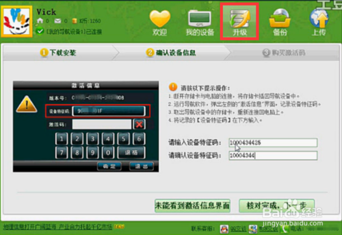 接著將導(dǎo)航儀SD卡通過(guò)讀卡器連接到電腦上,切換到“升級(jí)”選項(xiàng)卡,按提示輸入兩次“設(shè)備特征碼”。