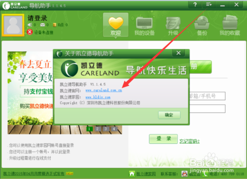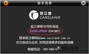此外我們還可以借助“網(wǎng)頁(yè)版”來(lái)升級(jí)凱立德導(dǎo)航地圖。從“凱立德導(dǎo)航助手”界面中點(diǎn)擊“菜單”按鈕,從其列表中選擇“關(guān)于凱立德導(dǎo)航助手”項(xiàng),即可彈出如圖所示的窗口,從中就可以進(jìn)入“凱立德”官方網(wǎng)站。