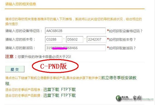 登陸“凱立德”官方網(wǎng)站成功后,就可以從打開(kāi)的“網(wǎng)頁(yè)升級(jí)”界面中,輸入有關(guān)導(dǎo)航儀設(shè)備的“設(shè)備名稱”、“特征碼”、“版本號(hào)”和“激活碼”,點(diǎn)擊“確定”按鈕,實(shí)現(xiàn)地圖的升級(jí)操作。