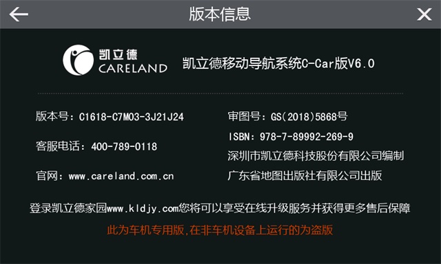 將存儲(chǔ)卡放回硬件機(jī)器中,打開(kāi)凱立德導(dǎo)航系統(tǒng),進(jìn)入【功能】->【幫助】->【版本信息】,查看版本信息,顯示為XXXXX-XXXXX-2342J07(2342W07)。您已成功升級(jí)凱立德2019版。