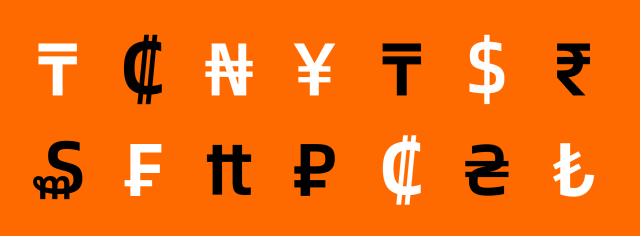 4、阿里巴巴普惠體不僅數(shù)字清晰易辨,就連貨幣符號,也囊括了當(dāng)前全球大部分重要市場,對阿里在全球的推廣至關(guān)重要。
