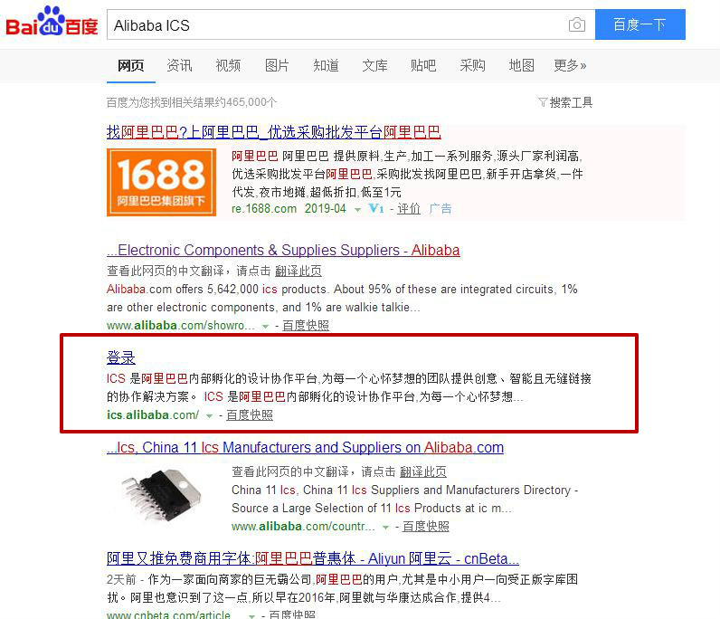 首先我們需要打開百度搜索,在搜索欄里輸入Alibaba ICS進(jìn)行查找,接下來打開紅框里的搜索結(jié)果即可。
