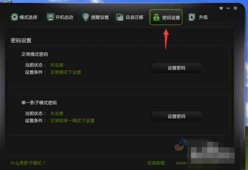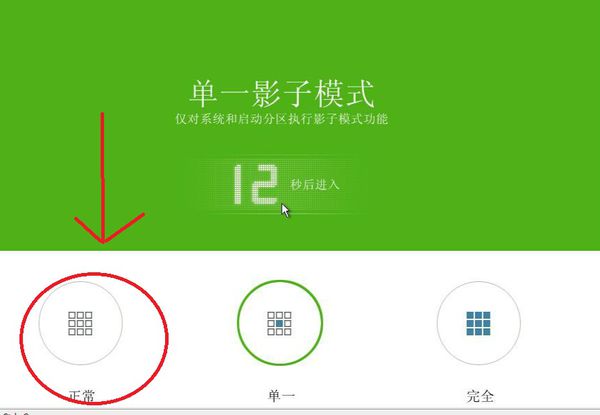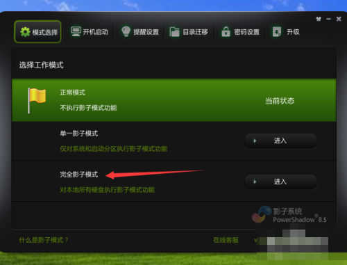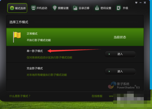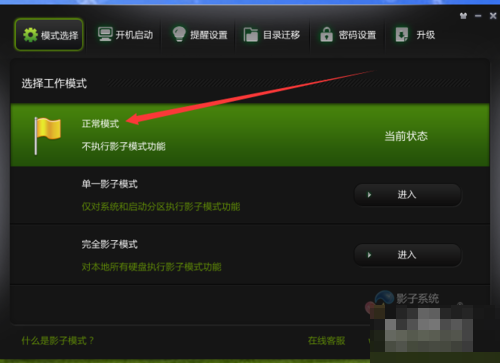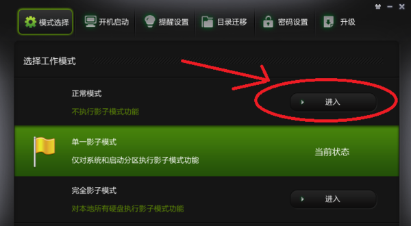 3、或者,打開影子系統(tǒng)軟件界面,點擊模式選擇,然后點擊正常模式右側(cè)的"進入"按鈕。