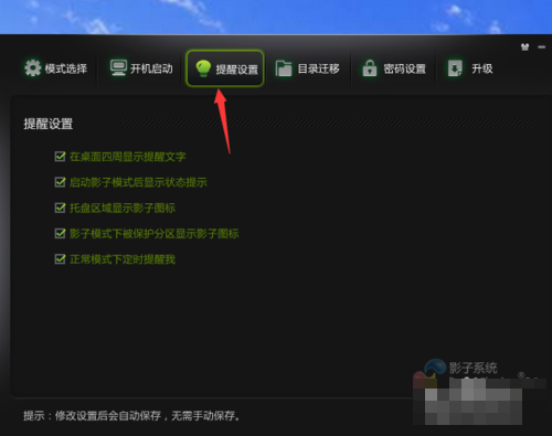 5、點擊箭頭所指的地方是提醒設(shè)置,這是為了防止大家在電腦進入完全影子模式又或者單一影子模式的時候下載文件或進行其他操作,如果在這兩種模式下操作,電腦一但重啟,數(shù)據(jù)便會消失。