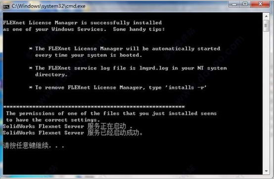 以管理員身份運(yùn)行“SolidWorks_Flexnet_Server\server_install.bat”并等到新服務(wù),將安裝并啟動(dòng)“SolidWorksFlexnetServer”。