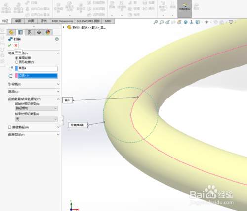 再次使用【掃描命令】。選擇5mm的圓為掃描界面,邊線為掃描路徑
