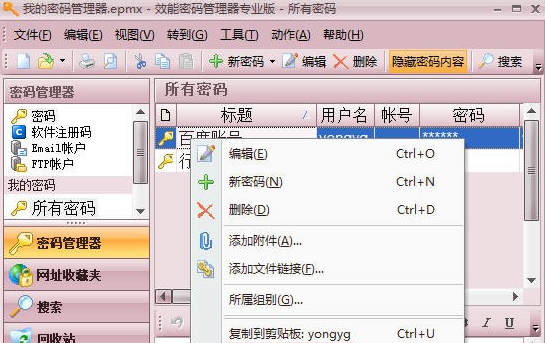 添加完成后,右鍵點(diǎn)擊這條記錄,就可以將您的用戶名或密碼覆蓋到剪貼板,還可以直接訪問(wèn)您記錄的網(wǎng)址。