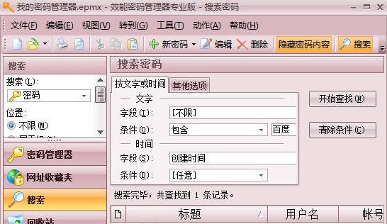 如果您想查找某個(gè)密碼,請(qǐng)單擊搜索按鈕。只要在文本框中輸入相應(yīng)文字,軟件將會(huì)為您呈現(xiàn)和之相關(guān)的密碼信息。