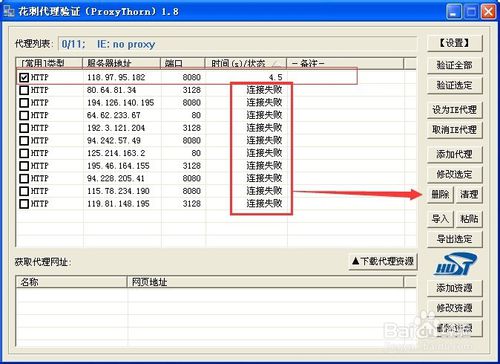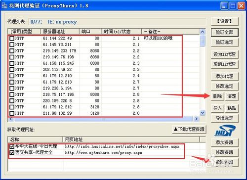 1、首先,清理掉軟件里面原來的那些代理地址,全選后點擊旁邊的“刪除”。