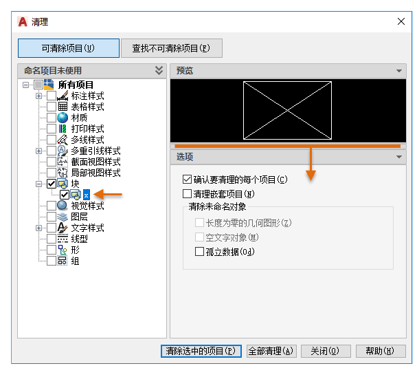 · 使用“未使用的命名條目”面板中的復選框,可以按類別選擇可清除條目,也可以逐一選擇它們。