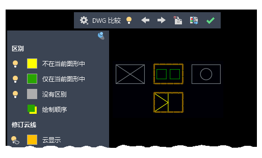 · 可以將比較圖形中以黃色亮顯的差異輸入到當前圖形中。如果執(zhí)行此操作,這些對象現(xiàn)在將存在于兩個圖形中,并將自動變?yōu)榛疑V荒茌斎胫付▍^(qū)域中不在當前圖形中的對象。