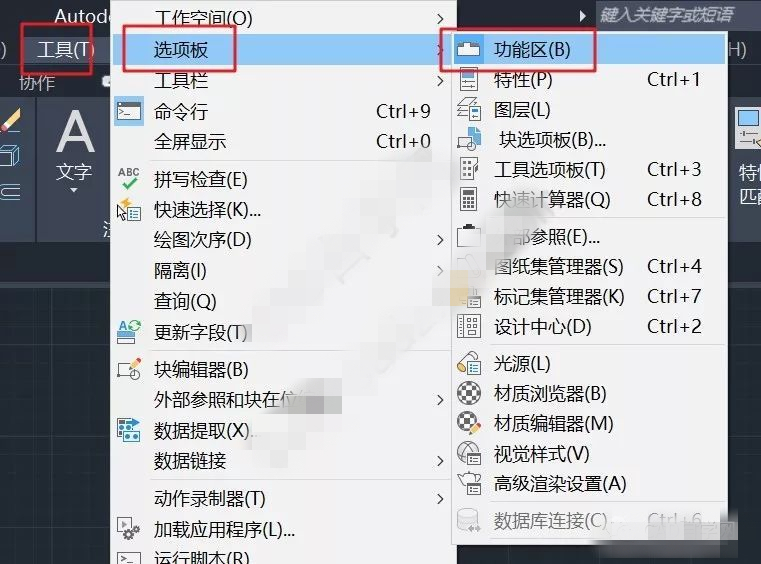 點擊【工具】菜單欄,選擇【選項板】,點擊【功能區(qū)】,關閉功能區(qū);