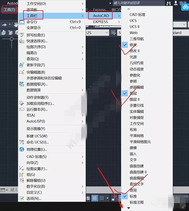 打開工具菜單,工具欄,AutoCAD,把標準,樣式,圖層,特性,繪圖,修改,繪圖次序勾上,如圖。