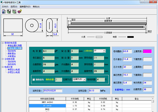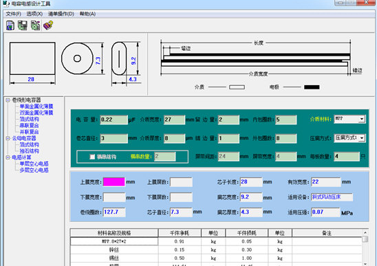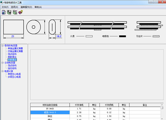 CLcal designer 當前包含了有機薄膜箔式電容器及其金屬化薄膜電容器的輔助設計和空心單層、多層電感的設計計算,其中電容器設計部分在靈活變通應用的情況下基本能夠?qū)Ω鞣N情況的卷繞型電容器進行精確的計算,如:單面金屬化及其多串結(jié)構(gòu)、雙面金屬化及其多穿結(jié)構(gòu)、有機薄膜加鋁箔結(jié)構(gòu),云母紙、電容器紙和有機薄膜復合介質(zhì)結(jié)構(gòu)等,有機薄膜包含常用的PP、PET、PC、PPS、PI等。當您經(jīng)過權(quán)衡不同的情況找到一種最為合理的設計后,設計參數(shù)可以保存成文本文件(*.txt)以備查,對應的主要材料消耗也可以存為Excel文件(*.xls)。運用該程序可以提高設計工作的效率。