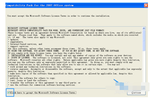 5、兼容包安裝文件名為 FileFormatConverters、exe,大小37M。下載完成以后,打開安裝包,勾選軟件使用條款并點擊 Continue 按鈕,如圖所示。