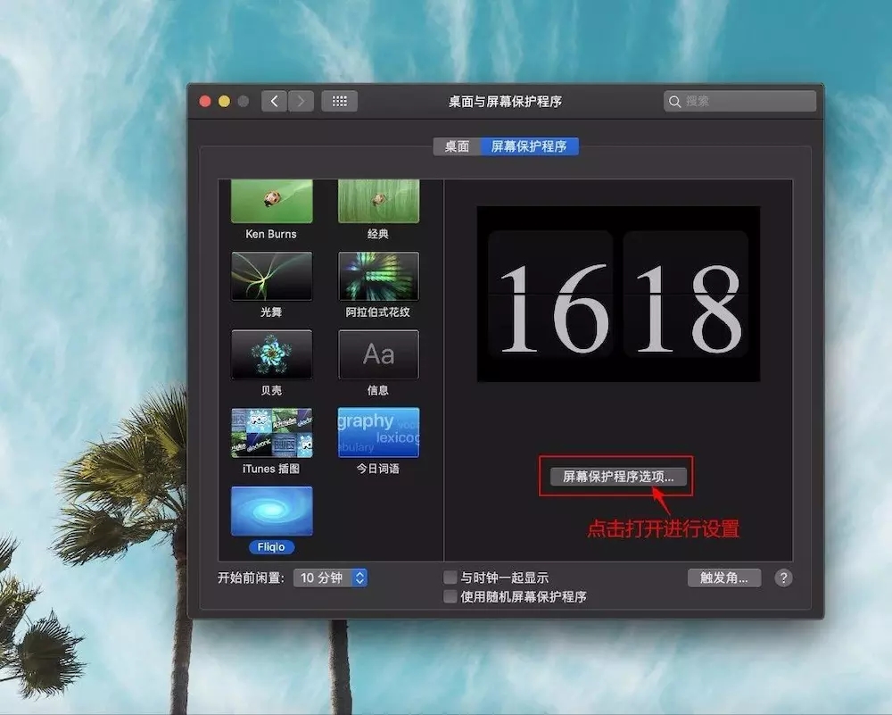 1、打開(kāi)Fliqlo,點(diǎn)擊“屏幕保護(hù)程序選項(xiàng)”進(jìn)行個(gè)性化設(shè)置: