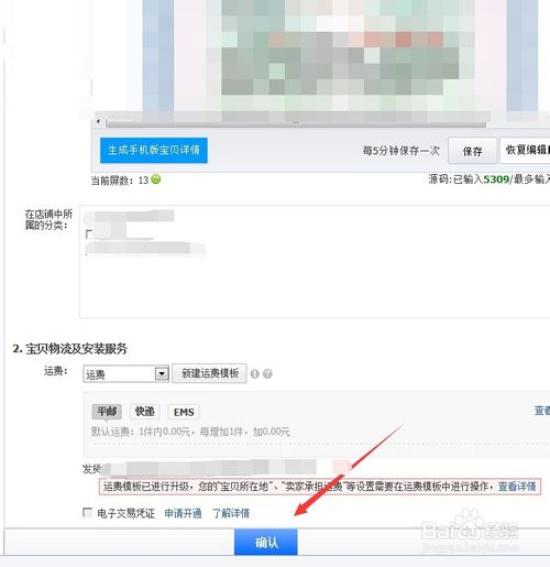 我接著完成商品的信息輸入,記得要設(shè)置運費模板,否則是發(fā)布不成功的,然后點擊底下的"確認"選項 如圖