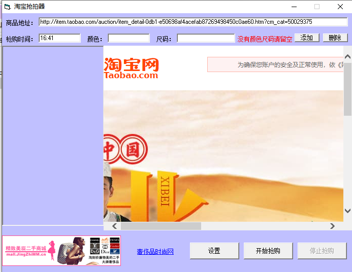 3、我們將寶貝的地址添加進來后,我們可以在下方設(shè)置寶貝搶購的時間、顏色、尺碼等信息,設(shè)置完成后開始下一步操作。