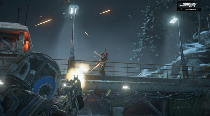 類(lèi)似的是,《戰(zhàn)爭(zhēng)機(jī)器4》新設(shè)計(jì)的武器系統(tǒng)與該系列已有的宇宙設(shè)定非常貼合,而且在單人劇情和多人對(duì)戰(zhàn)中都很平衡。Buzzkill會(huì)發(fā)射高速鋸刃,可以將敵人切成任意形狀。而Overkill武器套組則是短距離雙管散彈槍類(lèi)型的大殺器,任何人類(lèi)對(duì)手都能感受到它帶來(lái)的恐懼。最后,DeeBee勢(shì)力專(zhuān)有的EMBAR是一種沒(méi)有槍瞄的遠(yuǎn)程步槍?zhuān)惹按髌分械腖ongshot更加靈活。