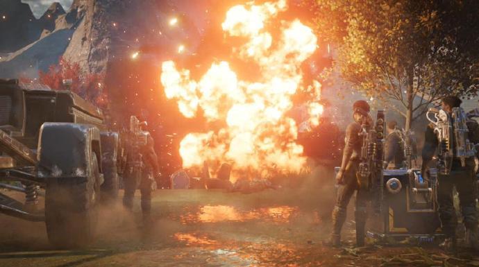視覺(jué)效果方面,《戰(zhàn)爭(zhēng)機(jī)器4》帶來(lái)的震撼并沒(méi)有超過(guò)2006年初代作品問(wèn)世的時(shí)候帶來(lái)的飛躍,不過(guò)本作依然是一款畫(huà)面華麗的游戲,畫(huà)面表現(xiàn)力最強(qiáng)的場(chǎng)景大多和天氣效果有關(guān),龍卷風(fēng)裹著沙塵,里面還夾著雷暴,周?chē)臉?shù)木在風(fēng)中搖擺,其他植被也都奮力拍打著枝葉。更出色的是,強(qiáng)風(fēng)天氣還會(huì)影響到慢速移動(dòng)的投射型彈藥,比如前面提過(guò)的Buzzkill,在風(fēng)中會(huì)被強(qiáng)風(fēng)吹出弧線軌跡,而且在射出中等距離以后就喪失殺傷力,因此必須根據(jù)天氣進(jìn)行武器選擇的考量。