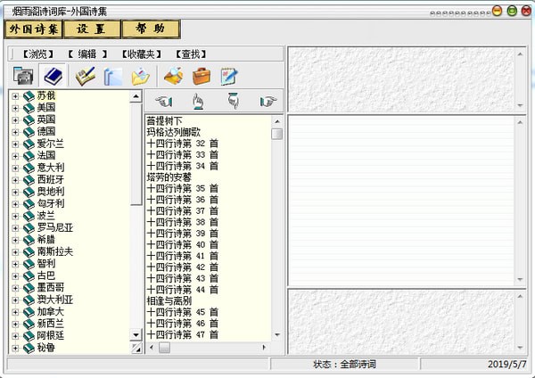 煙雨閣詩(shī)詞庫(kù)是收集了古今中外經(jīng)典詩(shī)詞、詩(shī)歌的一款詩(shī)詞庫(kù)工具,此詩(shī)詞庫(kù)共收集了中外古今著名詩(shī)詞六萬(wàn)四千余首,合計(jì)中外作家四千七百余人。軟件由“中國(guó)歷代詩(shī)詞”、“外國(guó)詩(shī)集”兩個(gè)獨(dú)立的模塊組成,其中每個(gè)模塊又有著多種功能,如:瀏覽、編輯、收藏等,而且,煙雨閣詩(shī)詞庫(kù)界面簡(jiǎn)潔干凈,界面充滿著古風(fēng)。其中中國(guó)歷代詩(shī)詞部份包括了先秦至現(xiàn)當(dāng)代四千余位中國(guó)著名詩(shī)詞作家的代表作品,外國(guó)詩(shī)集部份收集了近30個(gè)國(guó)家著名詩(shī)人的經(jīng)典作品。