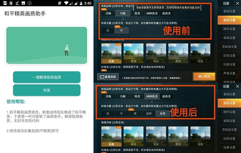 和平精英畫質(zhì)助手可以一鍵解鎖和平精英所有畫質(zhì),為玩家提供完美游戲畫質(zhì),支持極限畫質(zhì)修改、高幀率修改、畫質(zhì)優(yōu)化等功能,操作全程安全、穩(wěn)定、流暢,沒有任何封號風(fēng)險,最大幀數(shù)限制全解鎖,讓大家玩游戲更加隨心!【軟件特色】