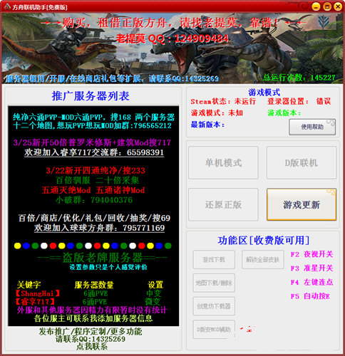 1、下載游戲方法:啟動軟件 點擊 更新游戲 會自動用Steam命令下載正版最新方舟,請確磁盤空間有100G以上(下載完成后把本軟件放到下載的游戲根目錄)