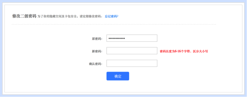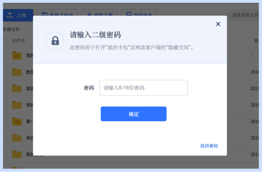 除了帳號登錄密碼,您還可以設(shè)置二級密碼鎖來進(jìn)入網(wǎng)盤,保護您存儲在網(wǎng)盤上的信息與數(shù)據(jù)。