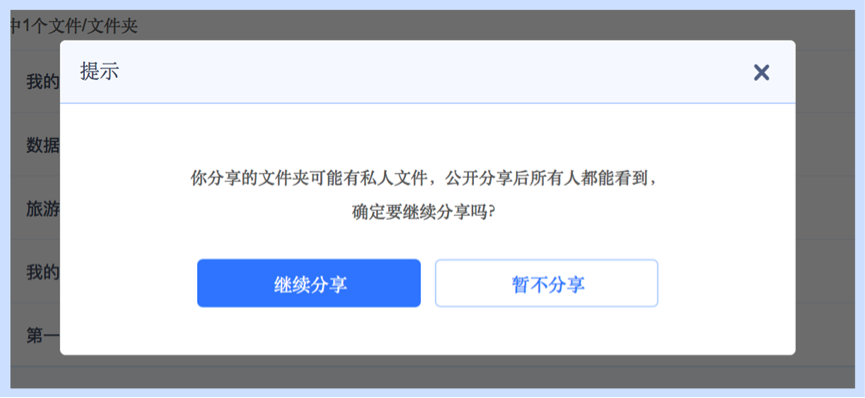私人文件夾分享前進(jìn)行風(fēng)險提示:對于可能含有大量私人文件的備份目錄(如:「來自:iPhone」),在您分享文件夾時會收到風(fēng)險提示,避免您無意中泄露個人隱私。