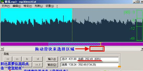 1、拖動滑塊:如果你對歌曲相當熟悉,知道自己想要切割內容所處的開始時間和結束時間,則可以直接拖動滑塊來設置切割區(qū)域的起始點和終點。具體操作:滑塊至起始點之后,點擊“設置起點”,接著繼續(xù)拖動滑塊至終點,最后點擊“設置終點”。提示:在滑塊拖動過程中可以隨時觀察“輸入”處“當前”所顯示的時間點