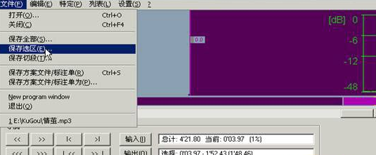 4.在兩個程序畫面中任選一個,然后在選中的Mp3DirectCut程序畫面的功能選項進入編輯→復制(動作后的畫面如圖4),然后回到另一個Mp3DirectCut程序畫面的功能選項進入編輯→貼上(動作后的畫面如圖5),這時就可以播放聽看看已被合而唯一的兩首音樂嚕,試聽完畢若有需要再將之點選程序功能的檔案→全部儲存即可。