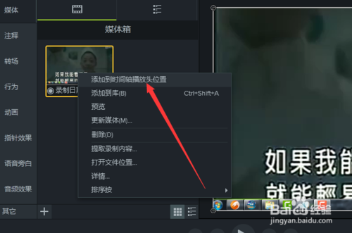 2、接下來把導(dǎo)入的視頻放到時間軸,可以是鼠標(biāo)直接拖拽或者是鼠標(biāo)右擊選擇添加到時間軸。