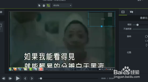 5、我們把出現(xiàn)的馬賽克四方塊,通過鼠標(biāo)拖拽到水印區(qū)域。當(dāng)鼠標(biāo)放到方框內(nèi)顯示為四個方向的箭頭的時候才進(jìn)行拖拽。并且我們可以通過鼠標(biāo)拖拽周圍的小四方編輯塊來調(diào)整這個馬賽克框的大小。只要足夠蓋住水印就可以了。