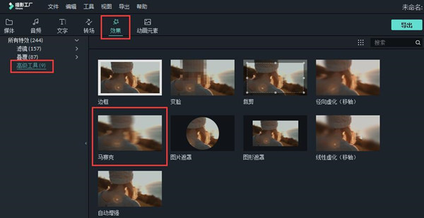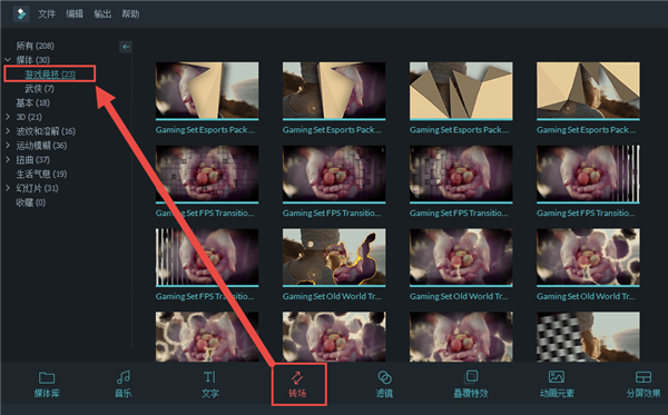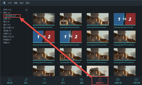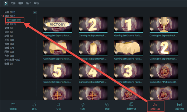 2、安裝完畢后,回到程序主界面,然后到資源庫(文字,轉(zhuǎn)場,濾鏡,動畫元素)通過資源包的名字找到相關(guān)的特效資源即可。